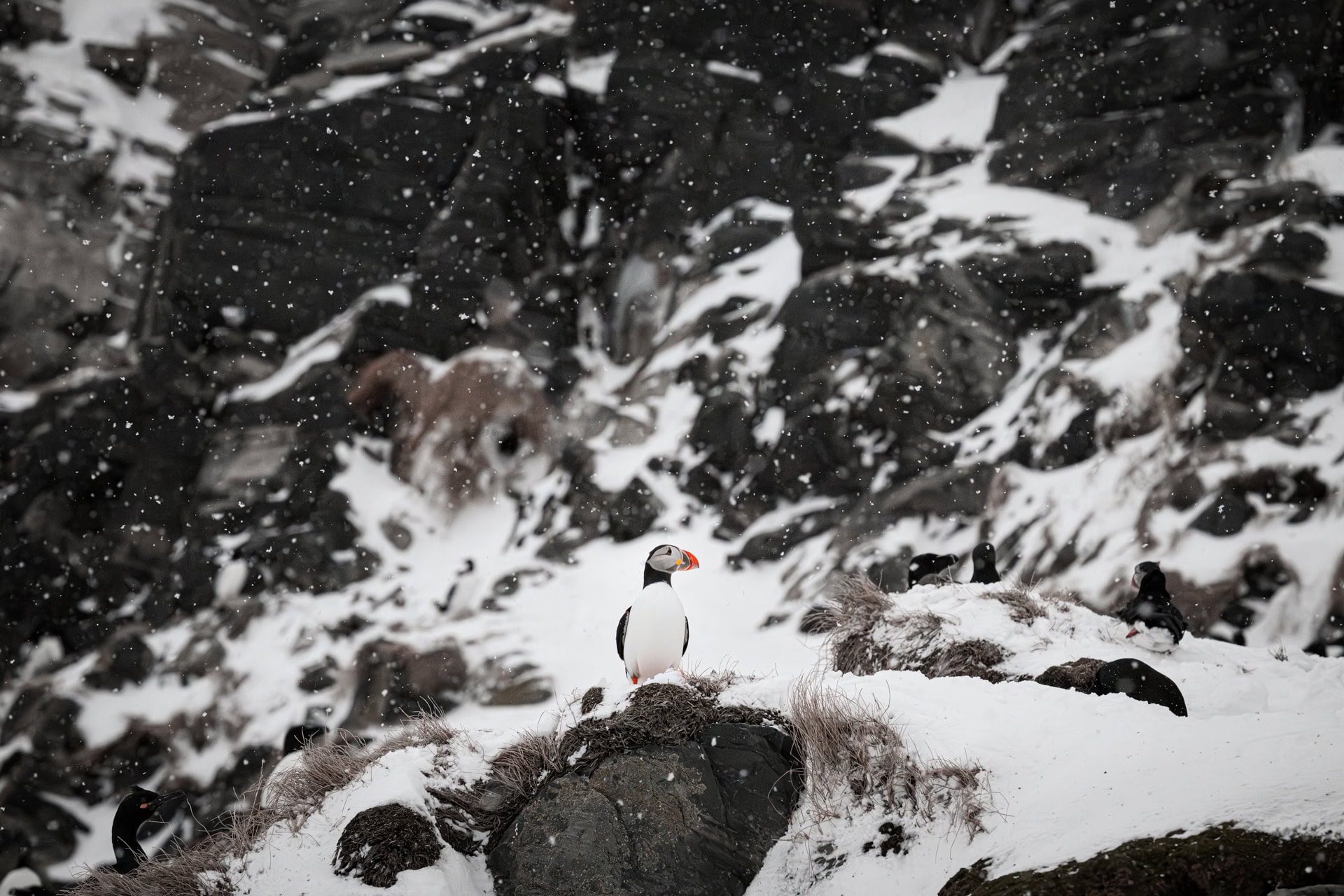 - a day on Hornoya island photographing and admiring puffins and other seabirds in Arctic winter conditions.